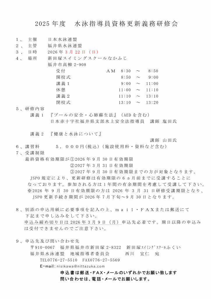 【案内】「2025年度 水泳指導員資格更新義務研修会」開催(2026/3/22)のお知らせ New! 2026年1月5日 最終更新日時 : 2026年1月5日 fukuiswim「2025年度 水泳指導員資格更新義務研修会」開催のお知らせを掲載2025年度(下期)水泳指導員資格更新義務研修会要項 (7)ダウンロード申込書【PDF】ダウンロード申込書【EXCEL】ダウンロード