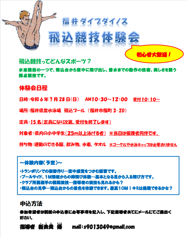 福井ダイブダイノスより「飛込競技体験会のお知らせ」を掲載します